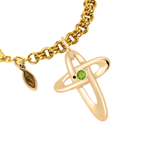 This contemporary Infinity Cross Charm/Necklace design provides an artistic twist on a classic design and is the perfect gift for a confirmation or baptism. Handmade in Maine, this design is made from 14k gold and is ideal for sensitive skin. The 1” long Infinity Cross features an interwoven pendant holding one of our faceted birthstone “peas”. Complement this charm with either a Twin Cable Heirloom Charm Bracelet or a Box Chain Necklace.