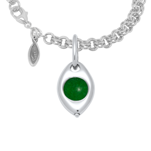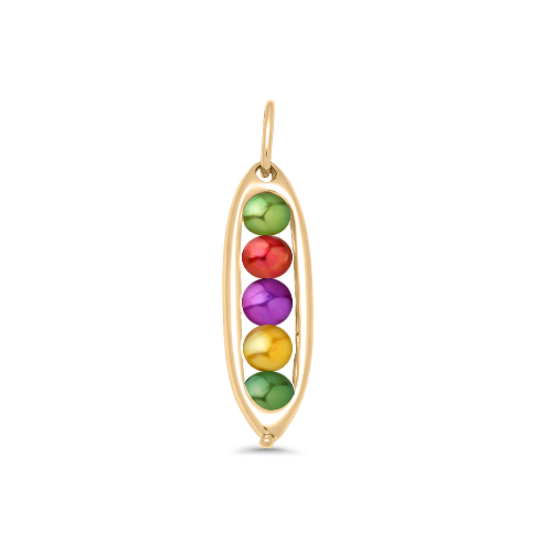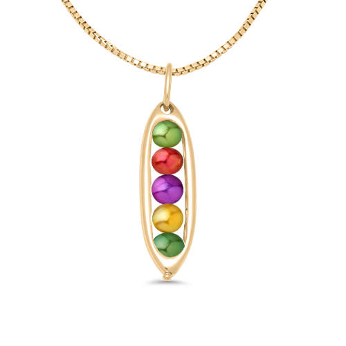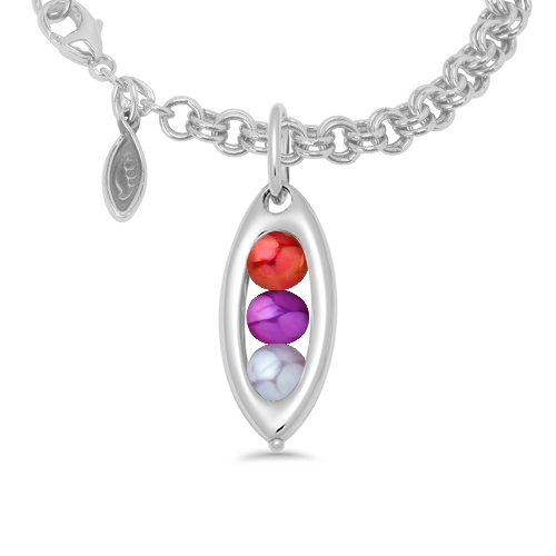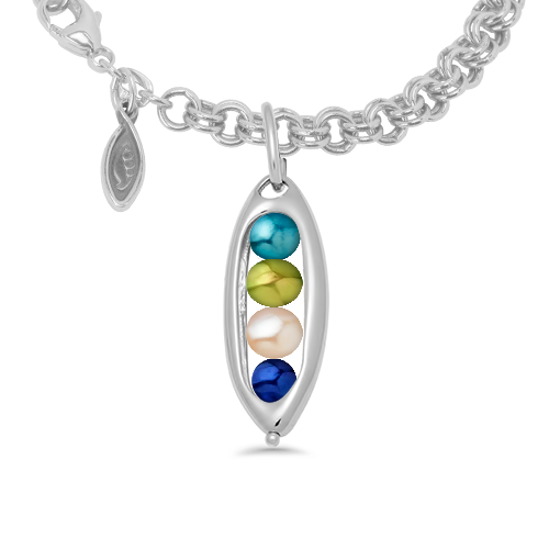 This elegant 5 Peas in a Pod Charm would make a meaningful gift for your best friend, mom, sister, bridesmaid, or partner: anyone who you consider the other pea in your pod! The peapod-shaped silver or 14k gold charm is set with five freshwater pearls or gemstone ‘peas’ to represent each person. The stunning pearls are custom dyed to match each month’s birthstone. The charm can be purchased alone, with a necklace chain, or with a twin cable heirloom charm bracelet.