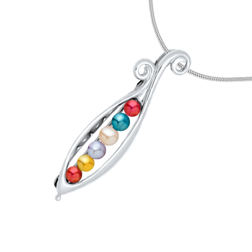 This elegant Mother’s Peapod pin pendant would make a meaningful gift for any mother or grandmother. The peapod-shaped pin pendant (available in 14 karat gold and silver) can be set with either five or six freshwater pearls to represent each member of your family. The pearls are custom dyed to match to correspond to birth months, so you can customize each piece to signify your family members.