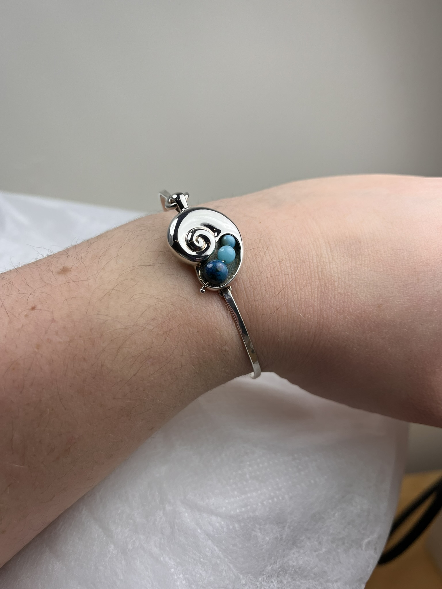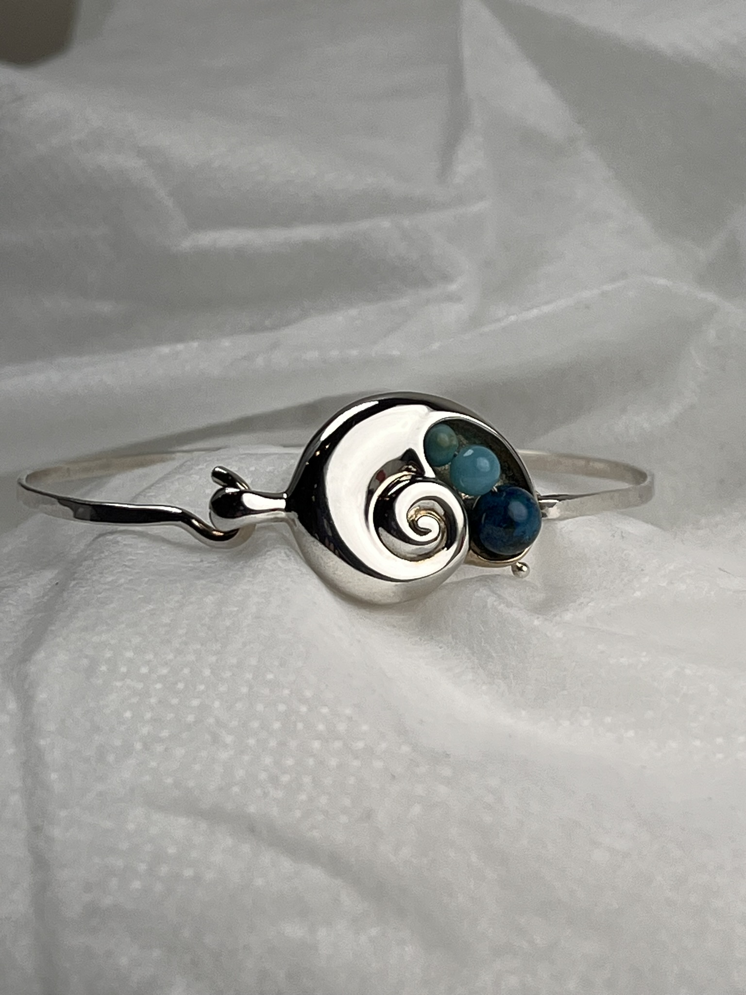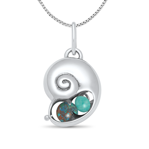 Known for its grace in the water, the chambered nautilus symbolizes strength in many cultures. You can channel this mollusk’s elegance and beauty with our handcrafted Nautilus Shell Peapod bracelet, available in sterling silver or 14k gold. The 1¼" x ¾" bracelet is available in three different wrist sizes and comes with your choice of three radiant “peas” — available in turquoise, amazonite, 14ky gold, lapis, freshwater pearl, and black pearl.