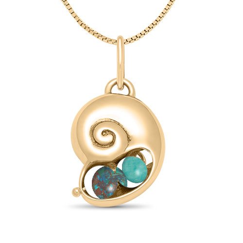 Known for its grace in the water, the chambered nautilus symbolizes strength in many cultures. You can channel this mollusk’s elegance and beauty with our handcrafted Nautilus Shell Peapod pendant. The 3/4″ length x 1/2″ width sterling silver, or 14k gold, pendant comes with your choice of two radiant “peas” — available in turquoise, amazonite, 14ky gold, lapis, freshwater pearl, and black pearl. Pair the pendant with our sleek snake chain available in lengths ranging from 16”-24”