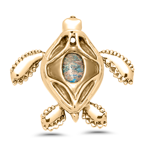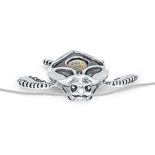 The Peapod Sea Turtle Necklace highlights the sea turtle’s association with wisdom, patience, and luck. It makes an excellent gift to mark an important milestone! This unique necklace features playful round ridges on the turtle’s arms and legs. In the center of the charm rests a rich brown and blue Turquoise, mimicking the appearance of the turtle’s shell under the water. Available in Sterling Silver or 14K yellow gold.