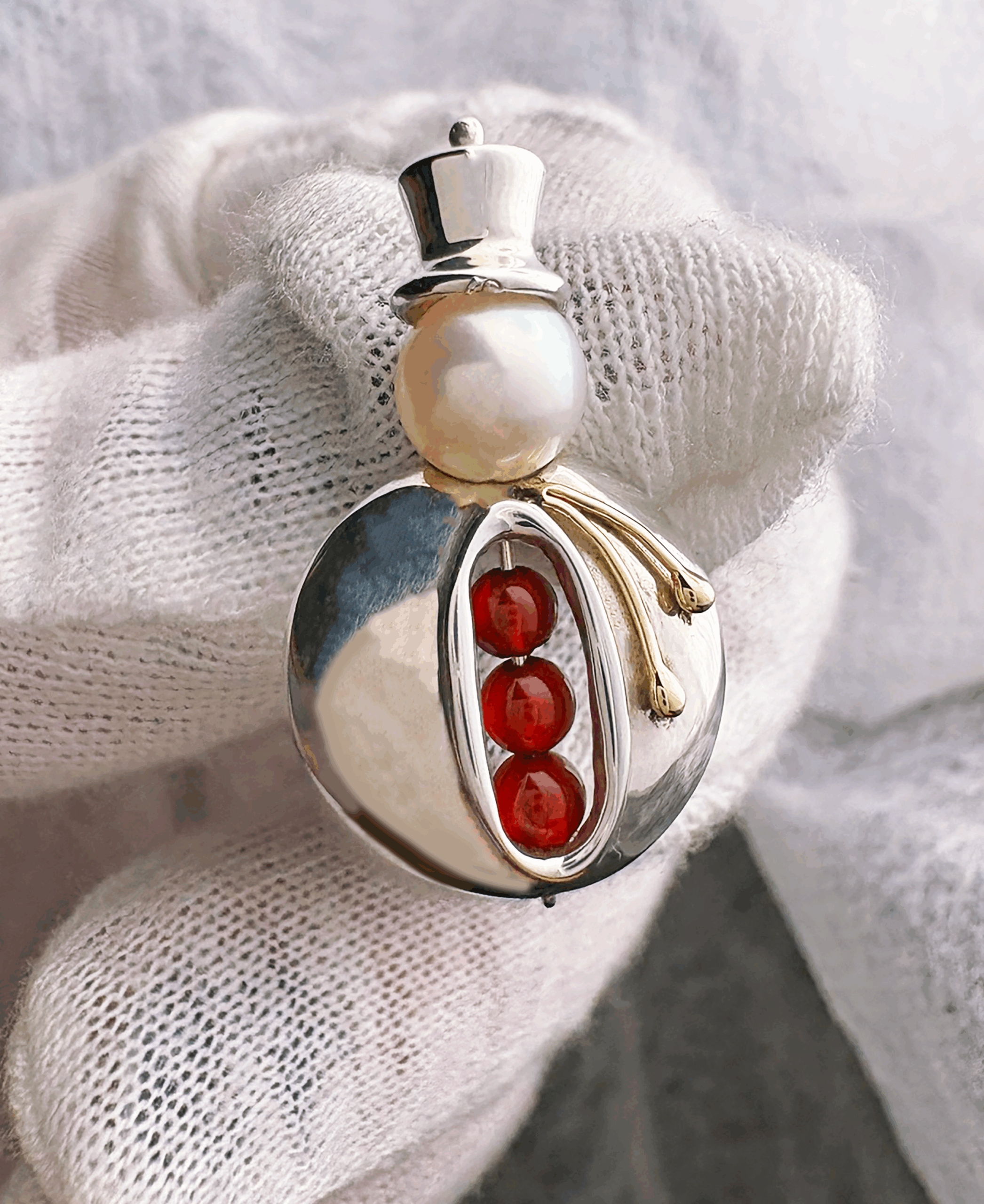 Head into the winter in style with our very own Snowman Peapod Necklace. Our pendant is embellished with our iconic white pearl “pea,” as well as three of our beautiful red carnelian “peas.” Complemented with a sleek chain that holds the pendant perfectly. The perfect Christmas gift to yourself or your loved ones, our Snowman Peapod Necklace is fun, charming, and playful. Available in striking sterling silver or 14k gold,