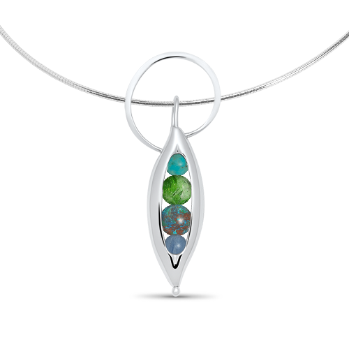 The Halo Collection includes the 3 Pea Halo Peapod Earrings, handcrafted 1” earrings holding three iridescent pearls. We also offer gorgeous Halo Mt. Katahdin Peapod Earrings inspired by the tallest summit in Maine. These earrings showcase an elegant circular halo that rests above a subtly-shaped peak filled with forest-colored stones like turquoise, kyanite, and chrysocolla.